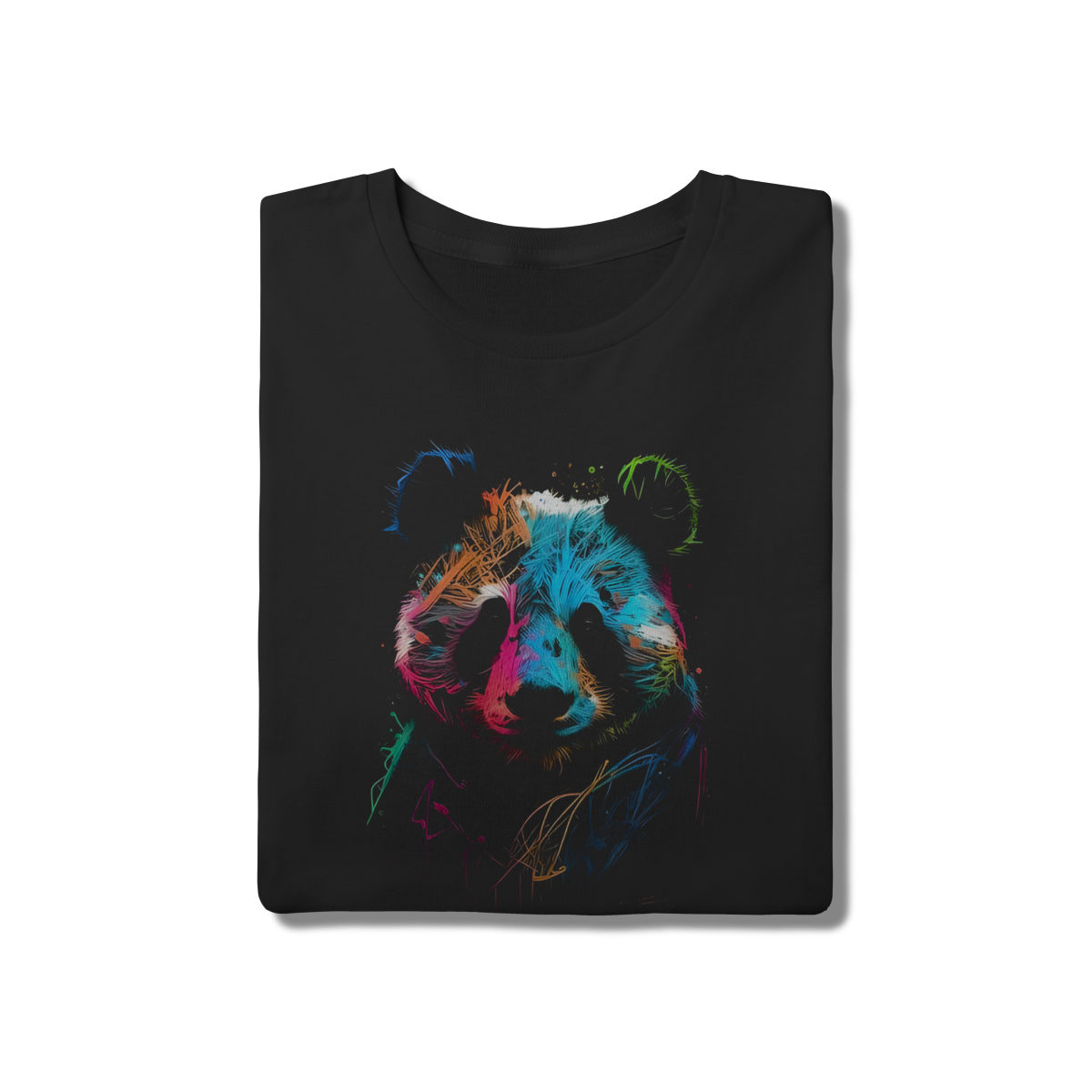 O clássico panda ganha uma roupagem moderna e vibrante. Com traços que lembram pintura artística e muitas cores, é a peça ideal para quem quer um look descontraído, artístico e cheio de vida